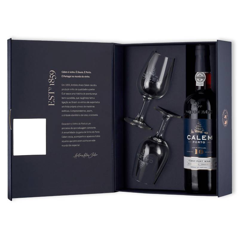 Ontdek de verfijnde elegantie van de Cálem Porto 10 Years Old giftset — een zorgvuldig samengesteld cadeau met een 10 jaar gerijpte Tawny Port en twee stijlvolle proefglazen.