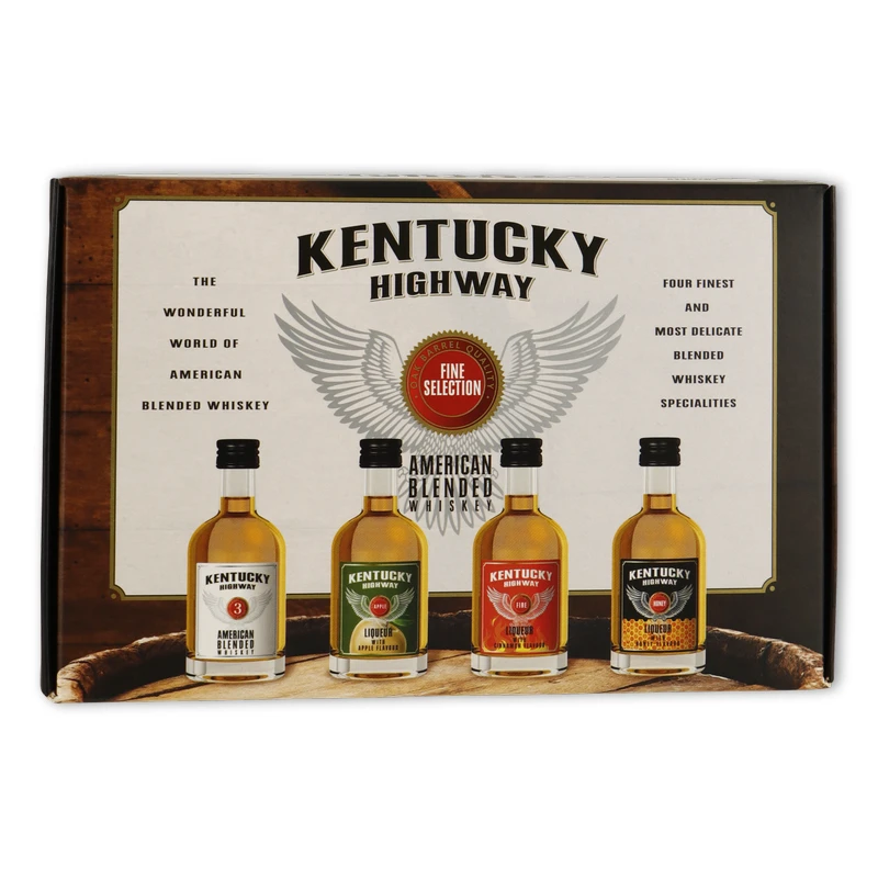 Ontdek vier smaken Kentucky Highway Whiskey in deze 4x5cl pack: Blended, Apple, Fire en Honey. Een stoer cadeau of heerlijke whiskeyproeverij!